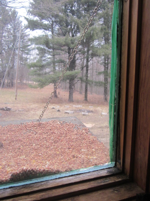 Ok. So maybe not in this picture. (I didn’t want to feel the past half hour spent waiting for the aforementioned birds to have been in vain, so I felt I had to include a photo of some sort. ) But this is the table feeder where we do see em when they visit. And there most definitely were some long-awaited, newly-arrived avian subjects visiting quite recently. (In fact there were a few milling about just a few moments before I pulled out the camera.) Yesterday, in a delightfully Spring-like teaser of a day, with sunshine and temperatures in the low fifties, there was an impressive reunion of birds at our feeder all day long. But today, nearly imperceptible flakes of snow swirl about in the air, and the world is winter-cold again. We all know it won’t last, but it’s a bit disappointing nonetheless. I’m less inspired to do my outdoor chores, and it seems the birds themselves are no more inclined to move about unnecessarily than I.