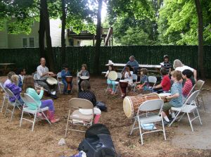 Elihu plays his djembe with the Irish jam session.