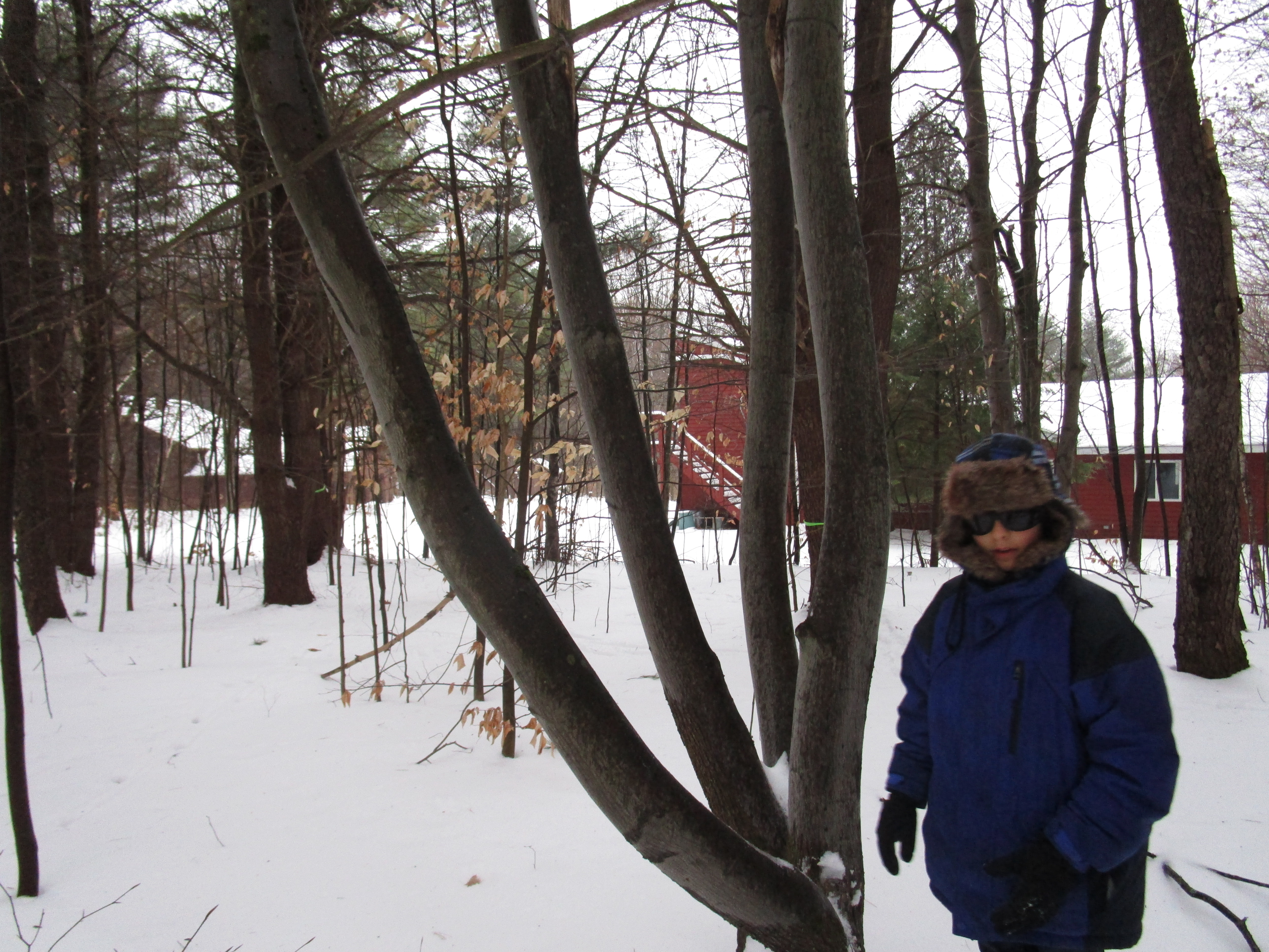 This interesting-looking tree will go. Behind to the right (red) is the Studio, on the left is mom’s house.