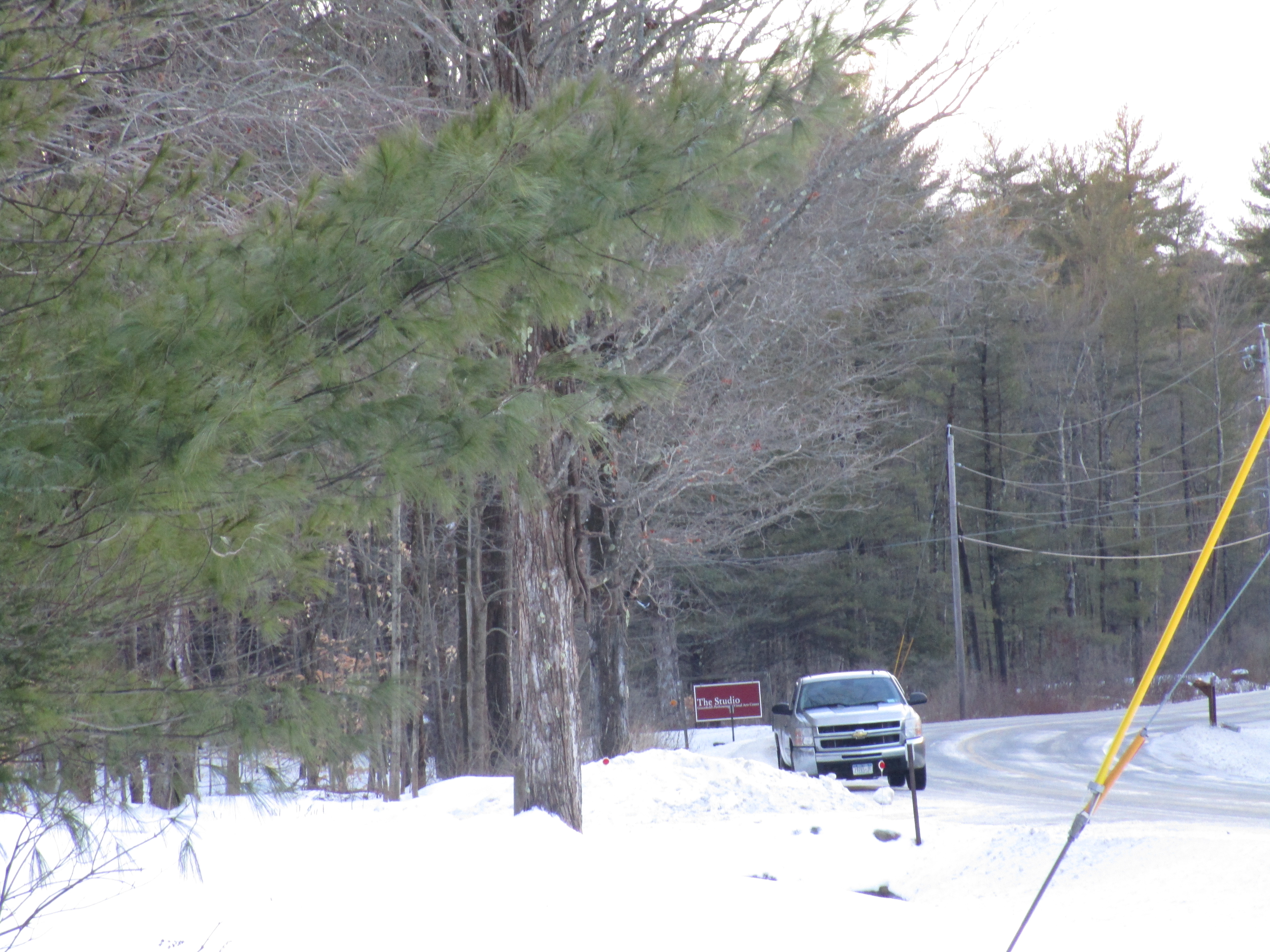 The other day Elihu and I marked off the perimeter of the Studio’s new parking lot with flags. This photo shows how things have looked for the past forty years on this stretch of Wilton Road, looking west. My parent’s property is on the left. Mom’s house, Andrew’s house and the Studio are all just behind these woods (that’s our neighbor’s driveway in the foreground).